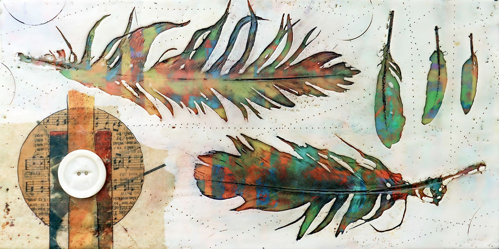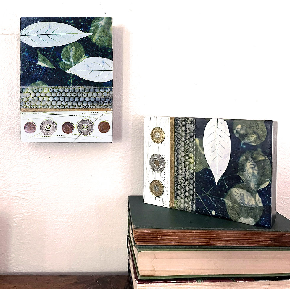 This collection is rooted in my love of gardening and the creatures it draws in. Each piece is created from fragments of botanical prints made with plants gathered from my own garden. I layer these with image transfers, leaf imprints, vintage notions, and bits of ephemera to build depth, texture, and story.